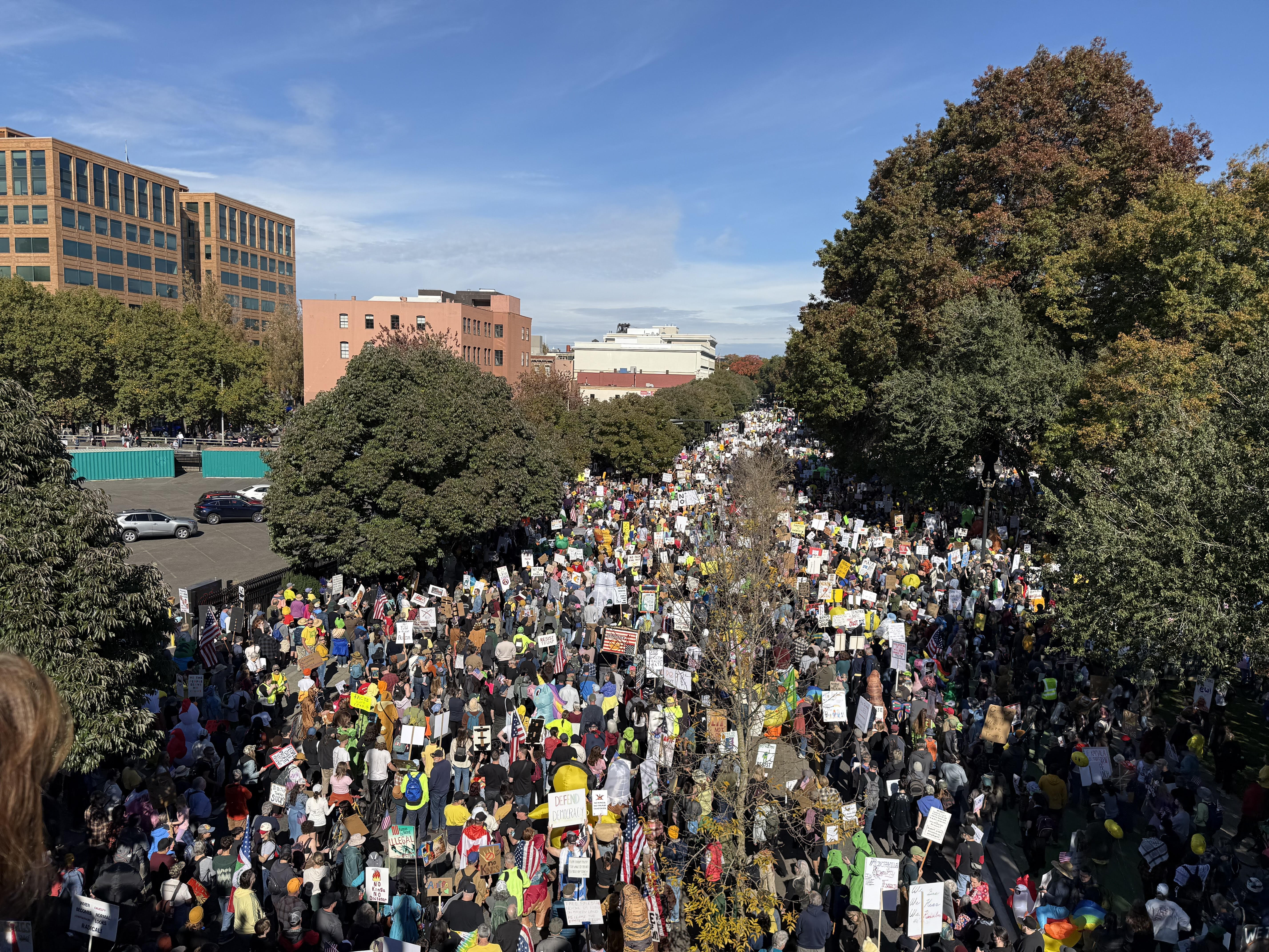 I joyfully participated in the No Kings protest in Portland today. It was an incredible experience to be in solidarity with so many people who share my concerns about this administration. It was our love of democracy and country that brought so many people out. We the people, sent a strong message to Trump, his cabinet, to our legislators, and to voters, that their actions with the military; with ICE; and with Federal employees and agencies are illegal, are immoral and corrupt. We are standing strong together. We will nonviolently fight this administration in court and at the ballot box and we will win!