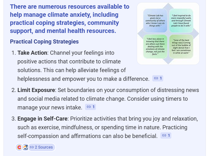 I will spend 15 minutes each day trying out climate anxiety resources that support mental and psychological well being.